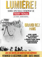 Pour cette projection-spectacle qui célèbrera l'événement de l'invention de la salle de cinéma, le 28 décembre 1895, Thierry Frémaux proposera et commentera une sélection de films Lumière auxquels une étincelante restauration restitue tout leur éclat. Saisie dans le silence du cinéma muet ou par la grâce de la musique du pianiste Didier Martel, toute la modernité d'une œuvre aussi extraordinaire que méconnue sera projetée sur l'immense écran du Grand Rex.